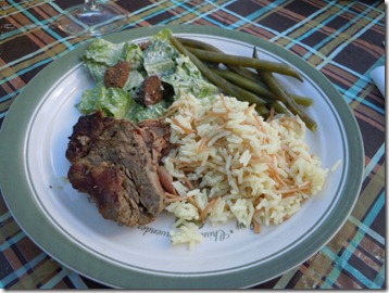 Steak, Caesar salad, green beans, and homemade rice pilaf.
